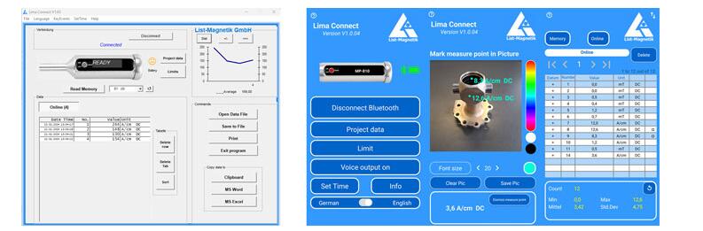 為了進一步處理您的測量數據,您可以將測量設備與移動Android和iOS設備配對?;蛘吣cWindows PC通信。這是通過藍牙低功耗技術(BLE)實現的。使用Lima Connect應用程序,您可以管理項目并在照片上分配測量點。測量結果可以進行統(tǒng)計評估并以圖形方式顯示。適用于Android、iOS和Windows的應用程序是免費的。